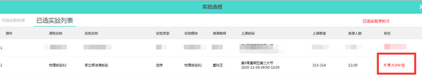 (3)旷课后如发现无法补选,即在“可选实验列表”中的旷课实验后面没有出现如下图所示的“允许补选”,可及时与本次实验任课老师联系,申请补选。