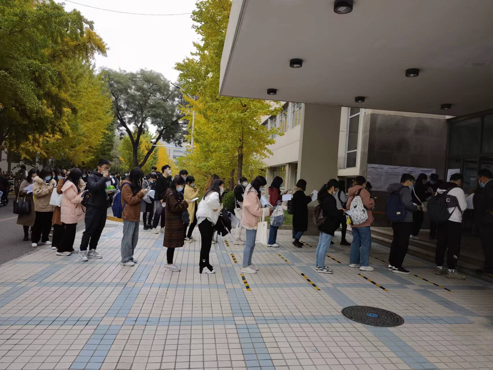 10月29日考试当天,为避免学生因为乘坐交通工具错过考试,学校为首场次跨校区考生安排了考试专用班车。按照防疫要求,在考场入口,实行严格的入场查验流程。并严格实行一场一消,重点区域和隔离考场重点消杀。
