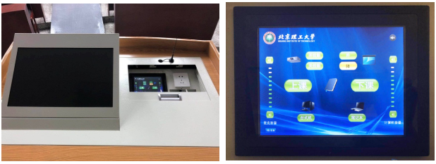 配备多媒体讲台、计算机、投影机、智能管控终端、液晶控制屏、音频功放等;支持蓝牙无线扩声;支持手持无线话筒扩声;教室后部区域为思政教学专用,配备有一块内置计算机的触控大屏。