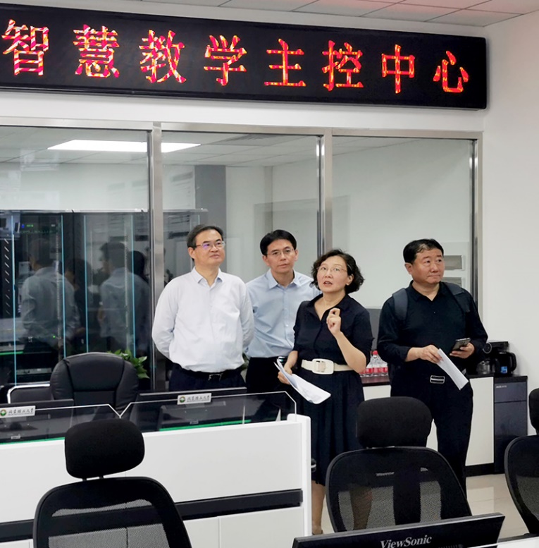 随后,张军校长带队来到位于文教1楼的智慧教学主控中心,通过监控大屏幕远程查看了中关村及良乡校区的所有教室课堂实况,并慰问了现场的工作人员。